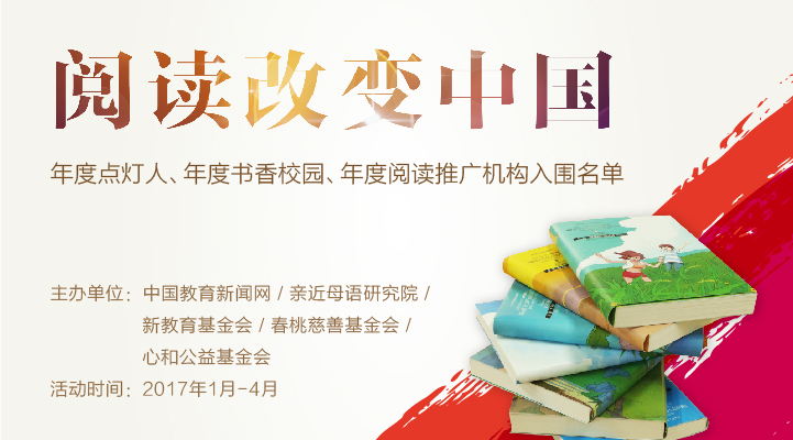 2017年1月,中国教育新闻网、亲近母语研究院、新教育基金会、春桃慈善基金会和心和公益基金会联合发起了2017“阅读改变中国”年度评选。本着民间立场、专业评选、公正公平的原则,此次评选汇集了学术界、教育界、公益界、媒体界、企业界多位知名人士作为推荐人。最终,共有49名点灯人、26所书香校园、16家阅读推广机构成功入围。