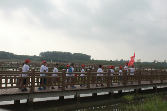 清晨,趁着气温还不高,营员们跟着老师一起去三国村外远足,边走边听老师讲这片土地的故事。我们所在的地方名叫马场山,相传是当年东吴大将周瑜大军养马的地方。郊外的早上,空气清新而又湿润,行走途中的美景不断,九莲湖里的荷花也开得正盛……